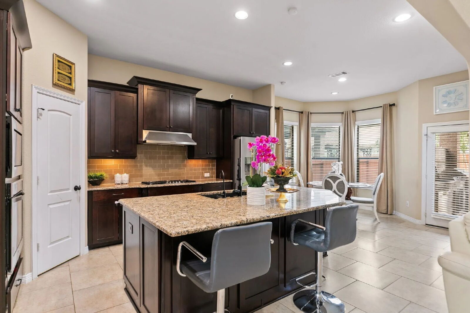 The gourmet kitchen is a chef’s dream—featuring granite countertops, a large island, and stainless steel appliances—all overlooking the spacious family room, making it perfect for gatherings and everyday living.